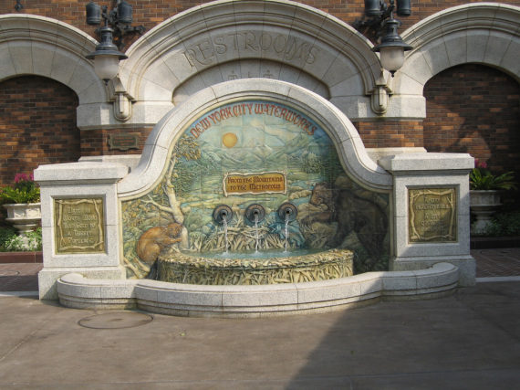 Art Direction – This is a theme painted  tile and granite fountain at an area restroom disguised as the New York Waterworks Building that I art directed at a theme park in Japan.