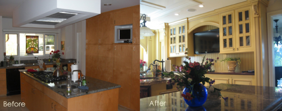 Cabinets – These modern slab door cabinets were not going to work with the new old world Euro design. My plan was to make these cabinets into individual pieces of furniture. My clients wanted to keep with the original layout as well as the appliances. In an effort to save my client on the over all cost and also achieve my goal, I discovered a design solution right before me. The existing cabinets lived in pockets, separated by 5 inches of drywall. To create my design I had fluted molding, corbels and base blocks applied to the drywall separating the cabinets. Crown molding and base completed the look. We installed new face-frames and doors and once painted and applied the decorative finish, we had individual pieces of furniture.