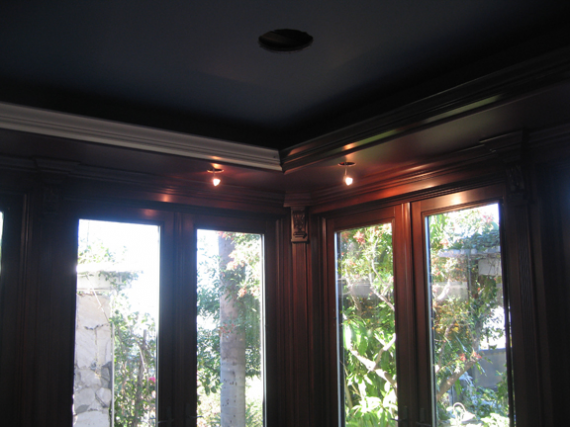 Ceiling – This room has a spectacular view. My client wanted doors around the perimeter of the room. We built an entertainment cabinet on one wall. Rather than typical door casing, which would look horrible, I directed the finish carpenter to continue the design of the cabinet through the doors making them apart of the cabinetry. In between each door is fluted molding and corbels, connected to a continuous crown molding and and base. All the woodwork received the same finish. This design ensured the woodwork is appreciated (it’s beautiful) but not become the focal point. The view needs to remain the focal point. Now for the ceiling. Color speaks and I listen. Dark blue spoke up. My clients thought I was crazy but agreed to try it. They loved it. The blue color invokes a feeling of warmth, anchors the woodwork and is not a distraction to the view.