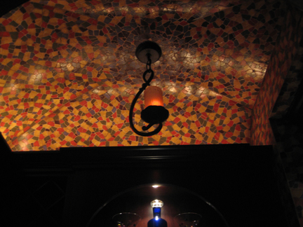 Ceilings –  I took a once useless space and transformed it into something special. This room was once a vestibule leading into a powder room. I moved the door to the other side of the powder room and closed the wall. A custom arch door was made  for the new room which I distressed and aged so that  it has a history (reclaimed from an older structure). I had cabinets made with integrated lighting  to display my clients collection of imported decorative liquor bottles and wine classed. To decorate the walls and ceiling I hand painted faux mosaic tiles and applied a patina finish. I chose a candle light fixture which adds additional character. This once empty space is now a show piece for the home. People believe the tiles are real which elevates the value of this room.