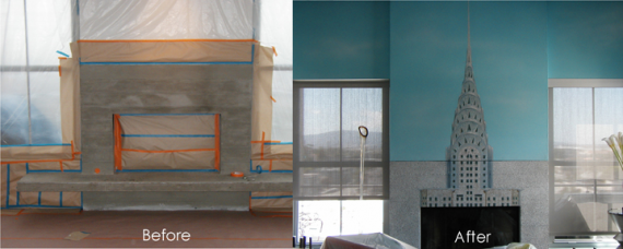 Fireplace – Faux White Granite and Mural on Concrete. My client being from New York, loves the Chrysler building.  For good reason he did not like his fireplace. I suggested painting it as white granite and hanging a painting of the Chrysler building above. He suggested bringing the building onto the fireplace… and that’s what we did. Chrysler Painting is by Danny Montes.
