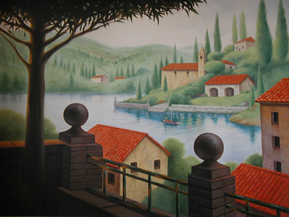 Murals & Tromp l’oeil – My client wanted a large piece of art to fill up this space (see European plaster on page 4). I contracted Danny Montes to paint this scene. The mural was painted off site and installed after we had completed the European plaster.